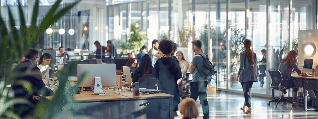 Alt text: Busy office with multiple employees using AI management software at their desks