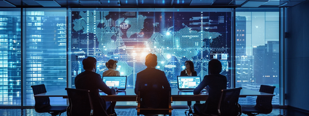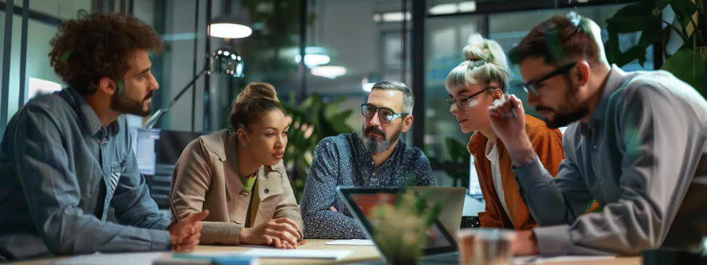 Alt text: Five business professionals are gathered at a desk discussing AI management software and its intelligent software solutions